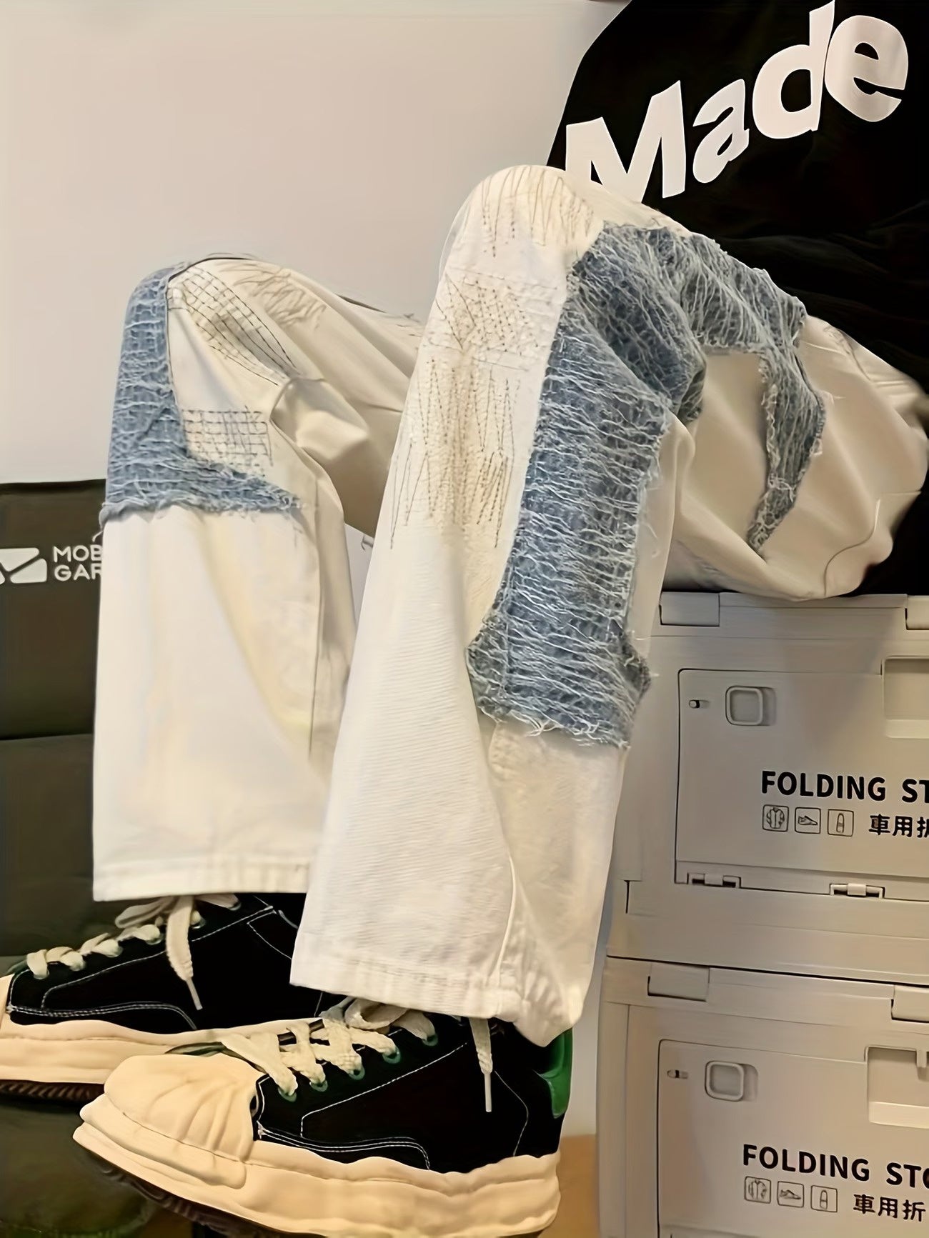 • Decoration: The patchwork and stitched panels are distributed across both legs.
