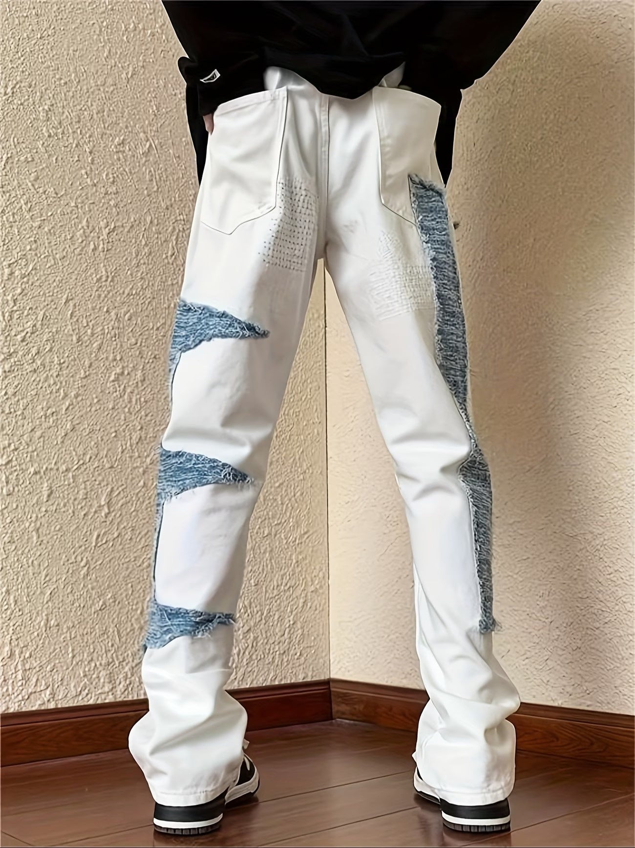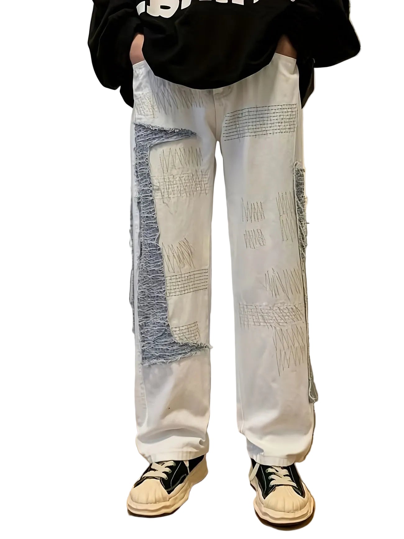 • Patchwork: Multiple stitched panels and patchwork sections are placed along the legs, including sides and knees.