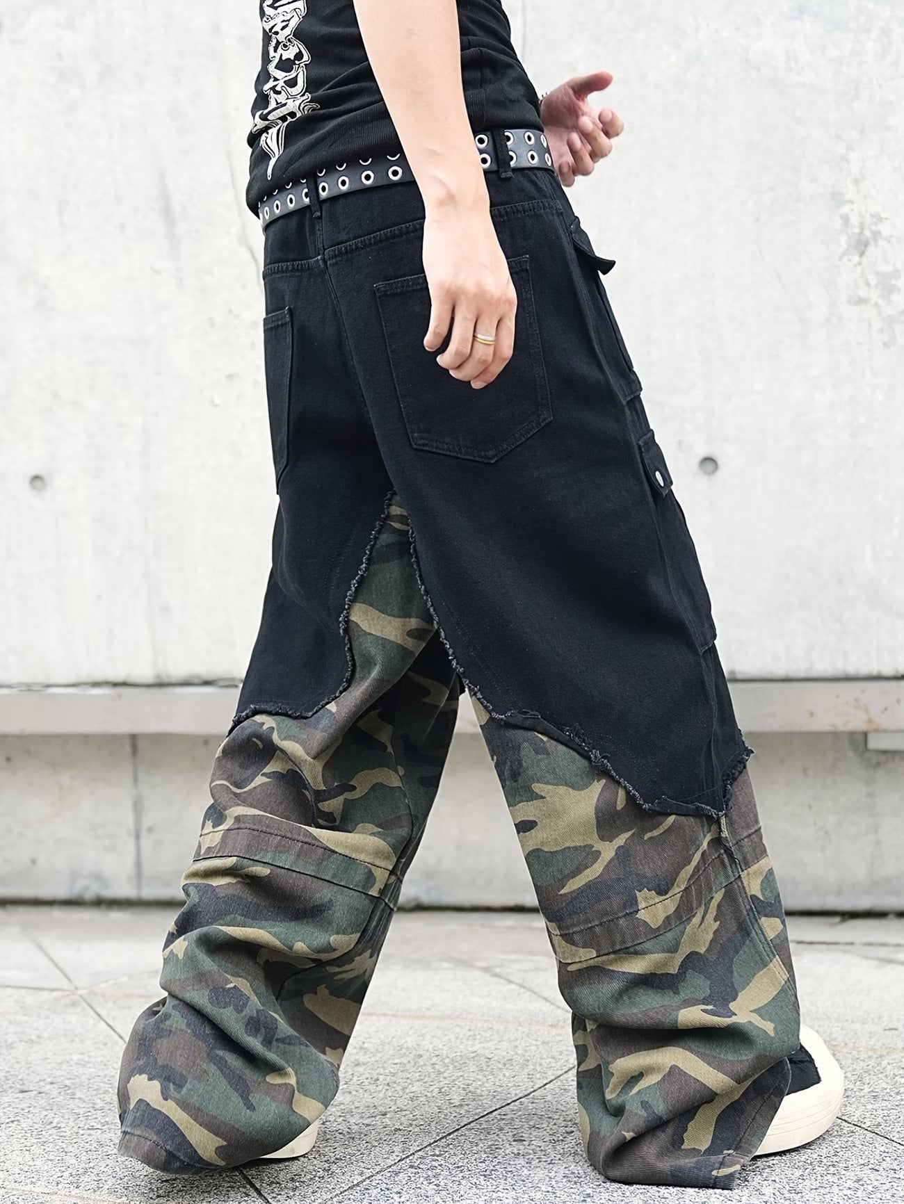 These men's pants feature a wide-leg fit with a straight shape from the hips to the hem. The upper portion extends from the waist down to the mid-thigh with a frayed hemline that angles upward toward the center. This top layer includes two smaller flapped pockets near the waist, two larger pockets lower down, and patch pockets on the rear. The lower portion begins underneath the top layer and extends to the feet, covered in a camouflage pattern across the wide-leg section.